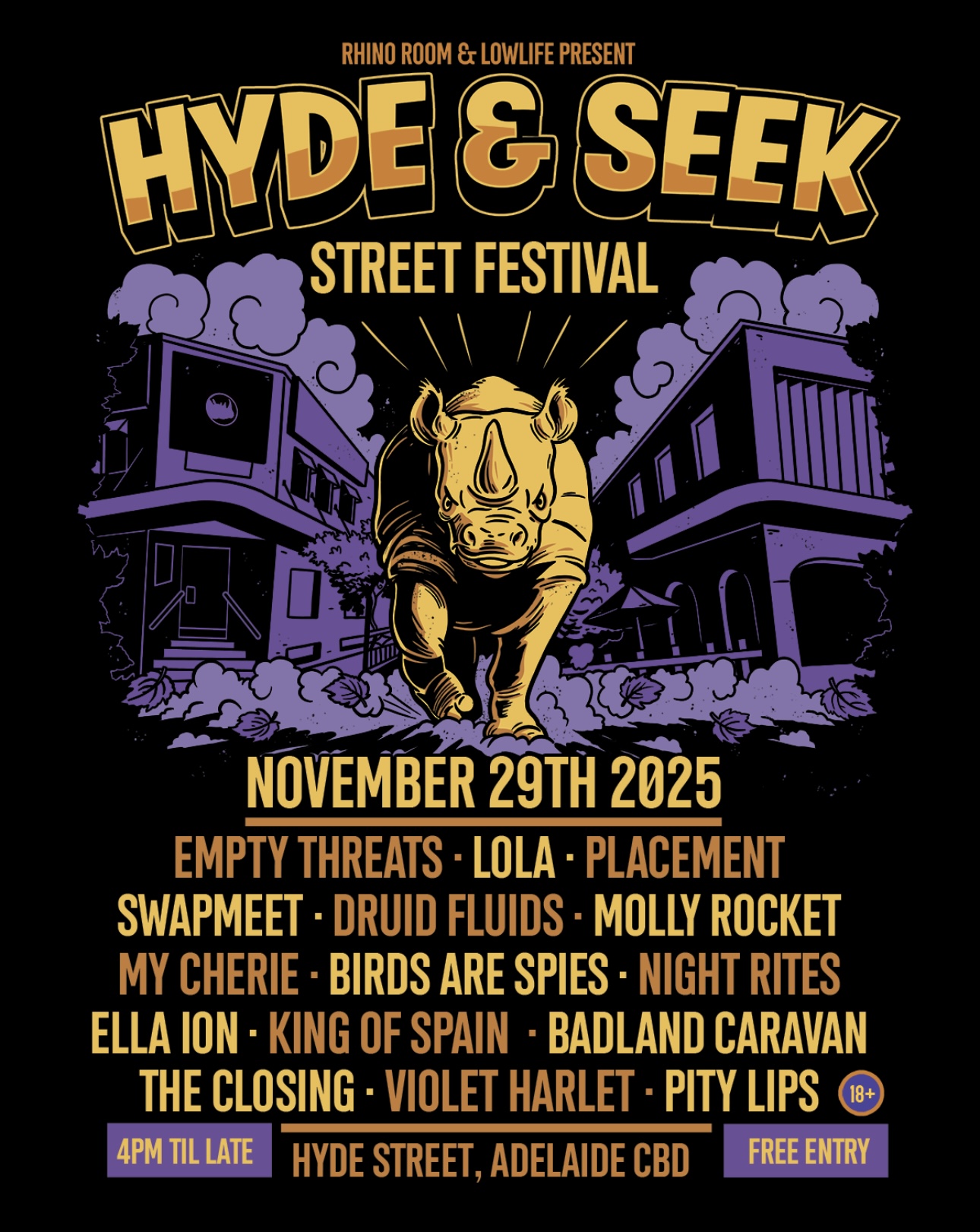 THREE STAGES -LOWLIFE BAR, RHINO ROOM, and a brand-new OUTDOOR STAGE on Hyde Street, which we’ll be closing off for festival FUN TIMES.